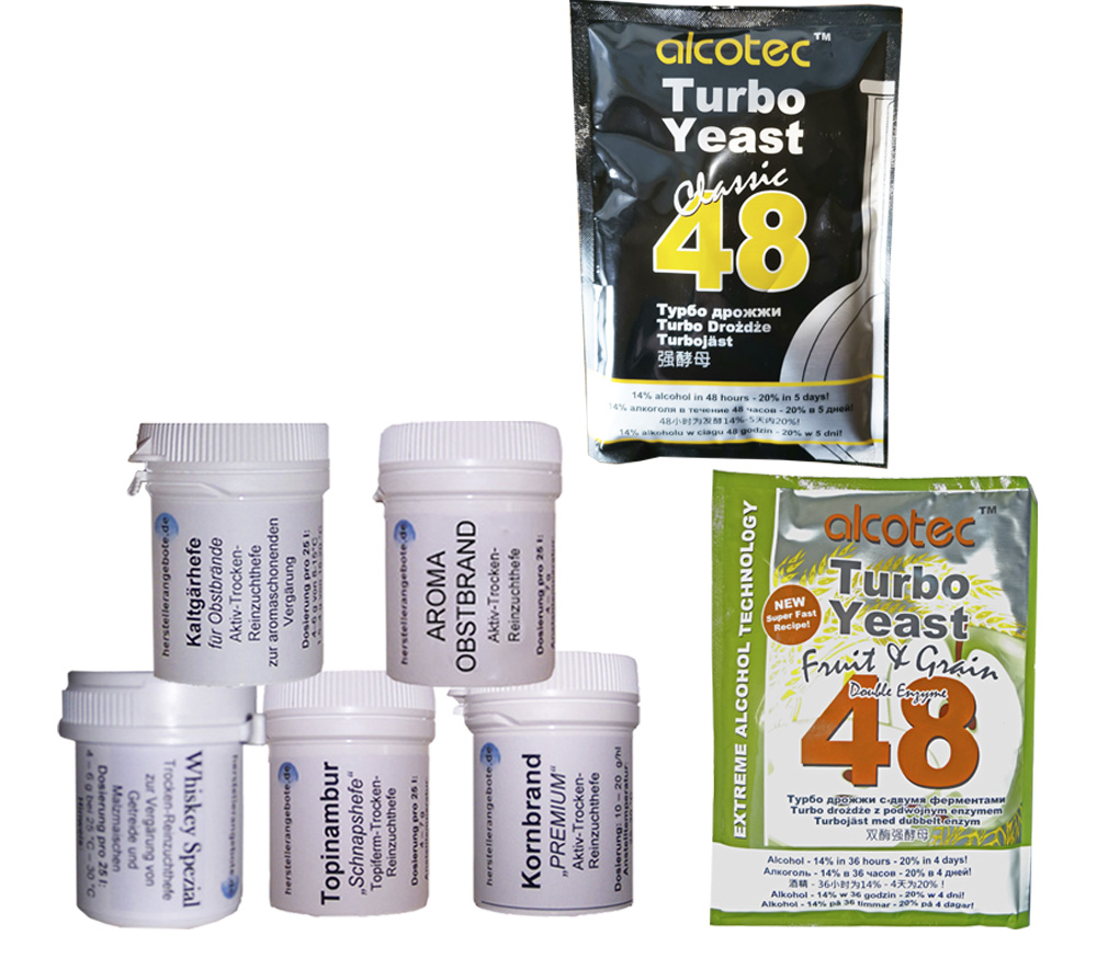 Turbohefe Alcotec 48H classic. Diese Turbohefe ist am besten geeignet, wenn man ohne Zugabe anderer Stoffe als Zucker in kurzer Zeit hochprozentige Maischen erzeugen möchte. Da die Konzentrationen bis zu 20 Vol.-% erreichen, ist diese Methode geeignet, ohne Primasprit leichte Liköre herzustellen.